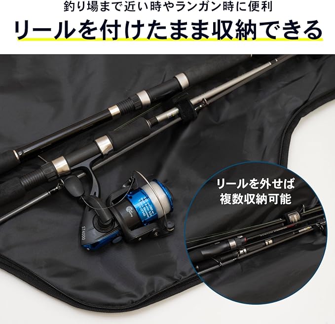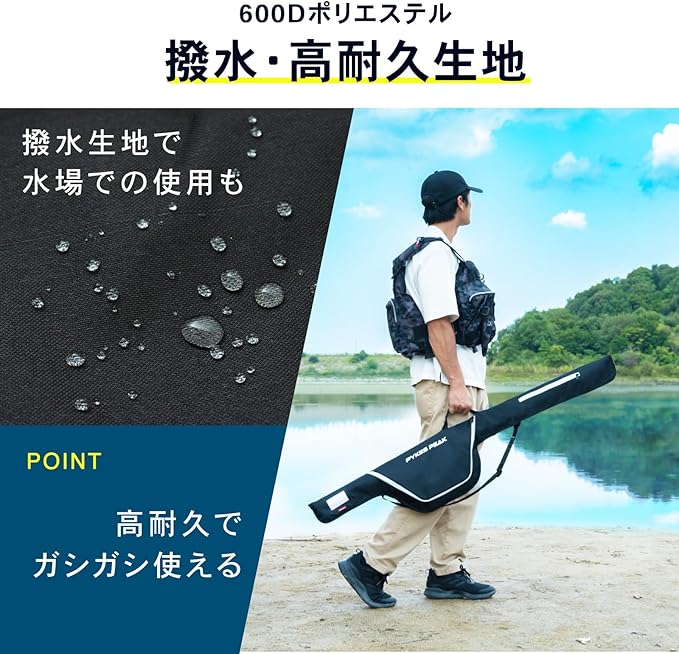 【高耐久な撥水素材を採用】高品質な撥水600Dポリエステルを使用しており、外部の衝撃や擦れから釣竿をしっかりと保護します。長くご愛用いただける頑丈な作りです。撥水仕様で天候に左右されず、雨の日でも釣竿を雨や湿気から守ります。