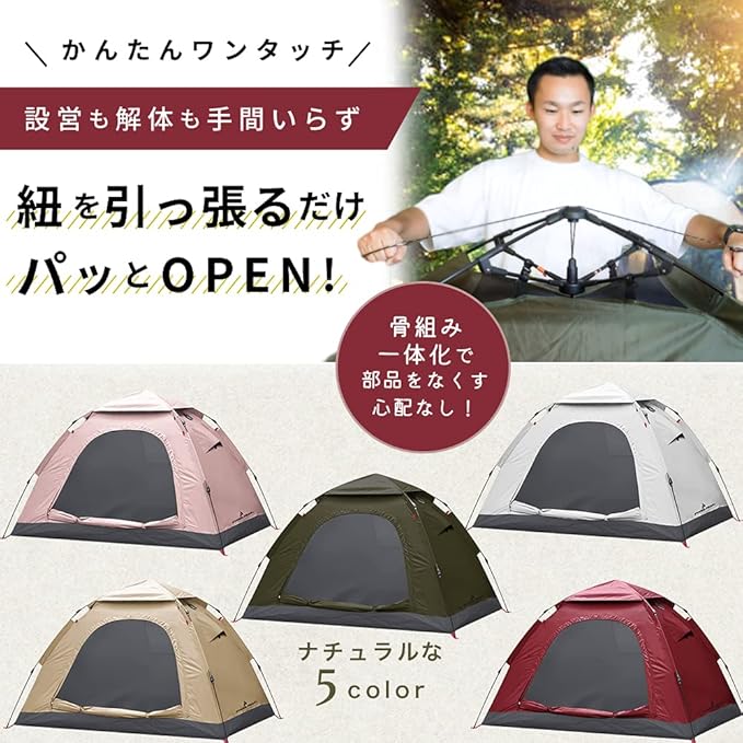 【適用の場所】 アウトドア、キャンプ、ピクニック、ビーチ、花見、釣り、登山、運動会、災害時など様々な場所で活躍できます。着換えやプライベート空間の確保、人目を気にせずに。役立つ場面が多いため、万が一の備えとして欠かせないアイテムです。※キャンプにでかける前に、取扱説明書通りに付属品がセットされているかを確認し、必ず一度組み立ててください。まれに縫製上の不備やセットミスなどにより、設営ができない場合があります。