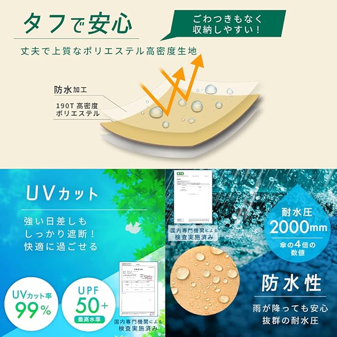 【抜群の紫外線カット / 雨水を通さない防水性】生地には耐久性に優れた190Tのポリエステルを採用!紫外線を99%カットし、紫外線遮蔽率はUPF 50+を実現。いかなる天候にも耐え、色あせやひび割れ、摩擦に強く、強度、耐久性を備えています。/耐水圧も2000mmあるので、ちょっとした雨や夜露で生地が濡れる心配もありません。