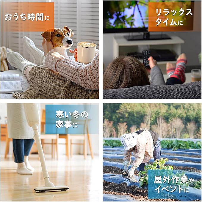 室内外での家事中などに。お家でのリラックスタイムにも適しています。