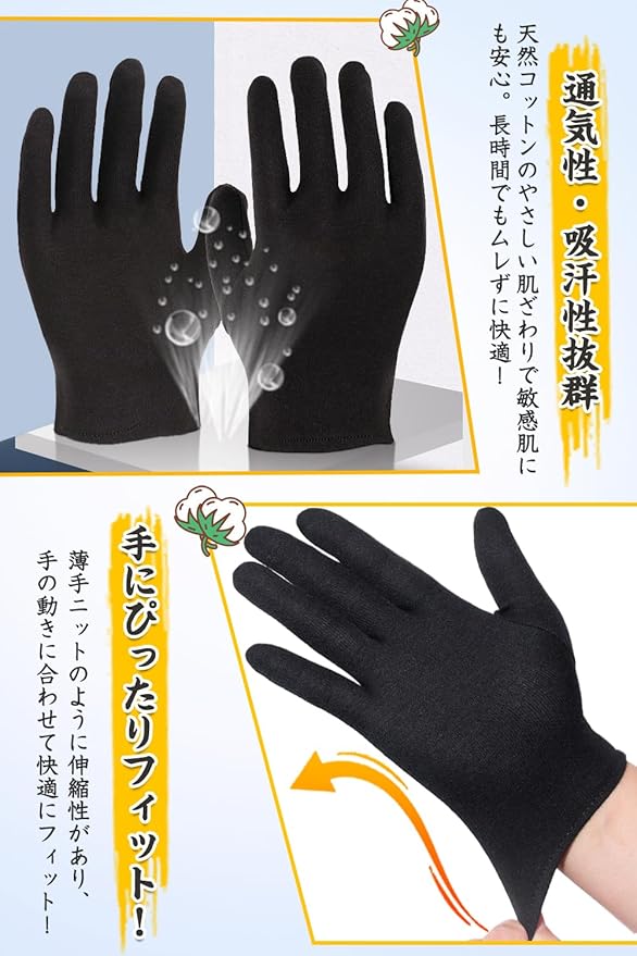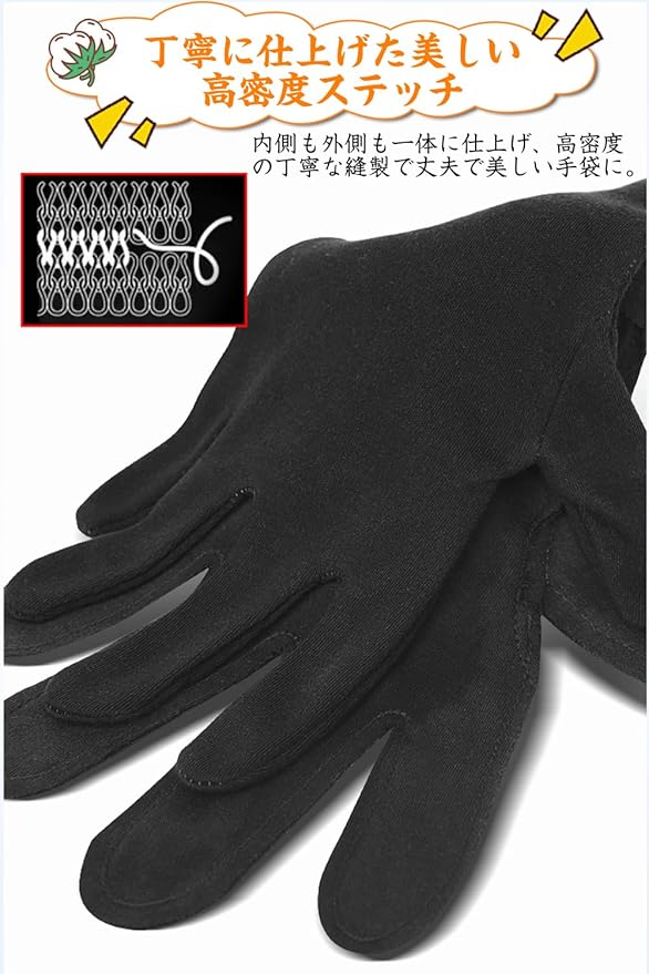 【 伸縮性のある薄手生地でフィット感抜群】 薄手の布手袋で柔軟性に優れ、指先までしっかりフィット。細かい作業やドライバー手袋として快適。ナイトケアのインナー手袋にも最適で、クリーム後の保湿や美容ケアをサポートします。作業用から普段使いまで用途が広く、機能性に優れています。