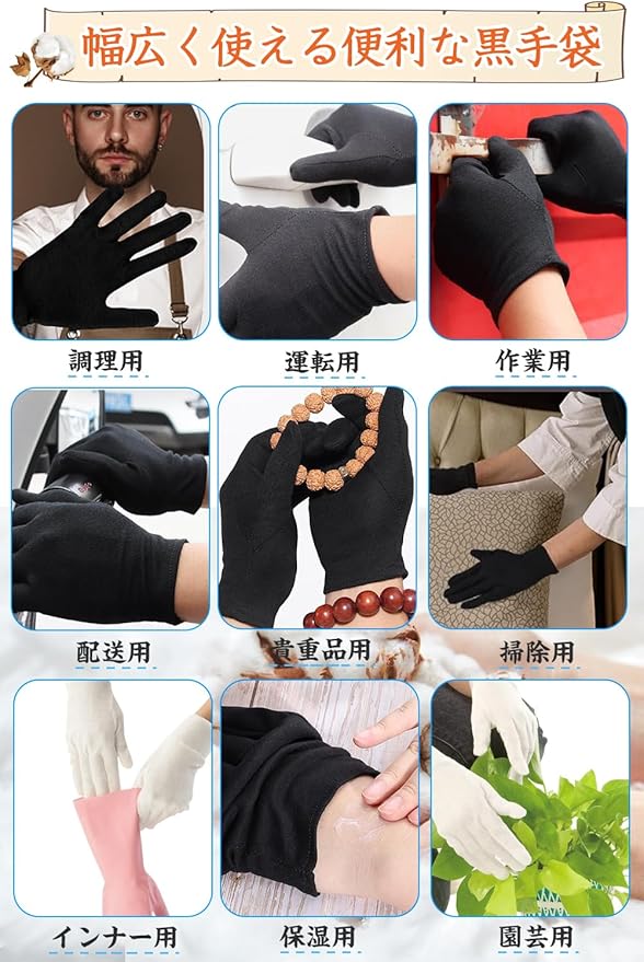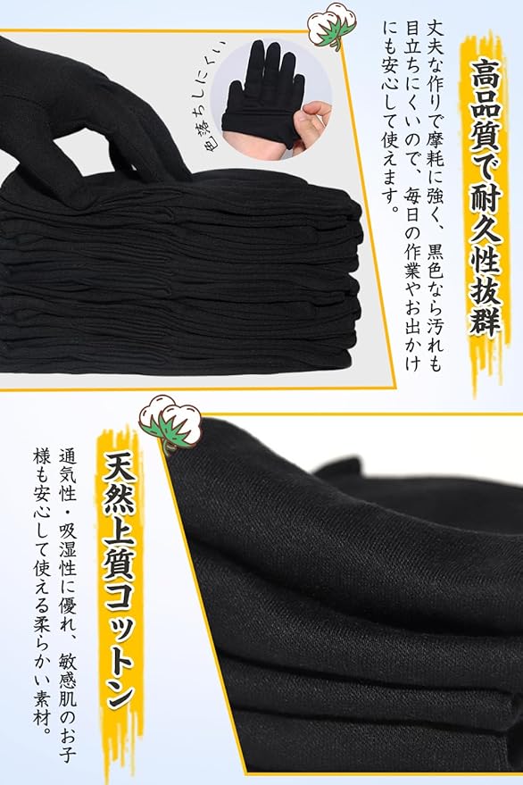 【 落ち着いた黒色で汚れが目立ちにくい】 黒手袋はシンプルで上品。白手袋に比べ汚れが目立ちにくく、清潔感を長く保てます。掃除や運転、作業用手袋としてはもちろん、接客・検品・フォーマルにも最適。布手袋の中でも黒は高級感があり、業務用や式典でも重宝されます。