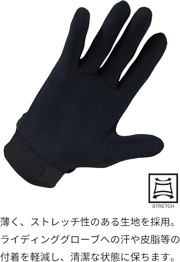 裏起毛生地を使用し、薄手ながら高い保温性と着け心地の良さを兼ね備えた、インナーグローブ。 ライディンググローブへの汗や皮脂等の付着を軽減し、清潔な状態に保ちます。