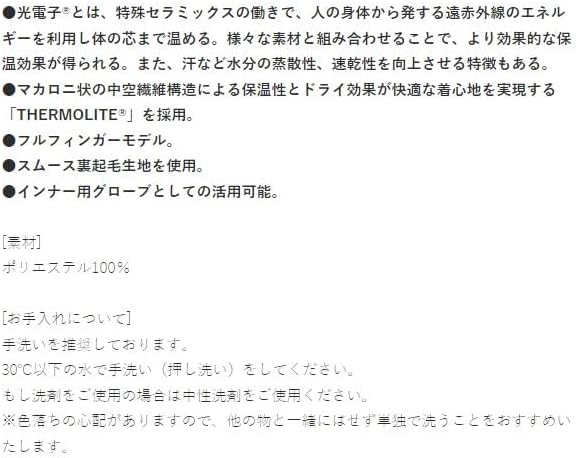 光電子 と断熱性に優れたサーモライト 繊維が、薄くて軽くて温かい手袋を実現。これ1枚で通勤や通学などの普段使いはもちろん、作業用途や厳寒期のインナーグローブとしても着用可能です。