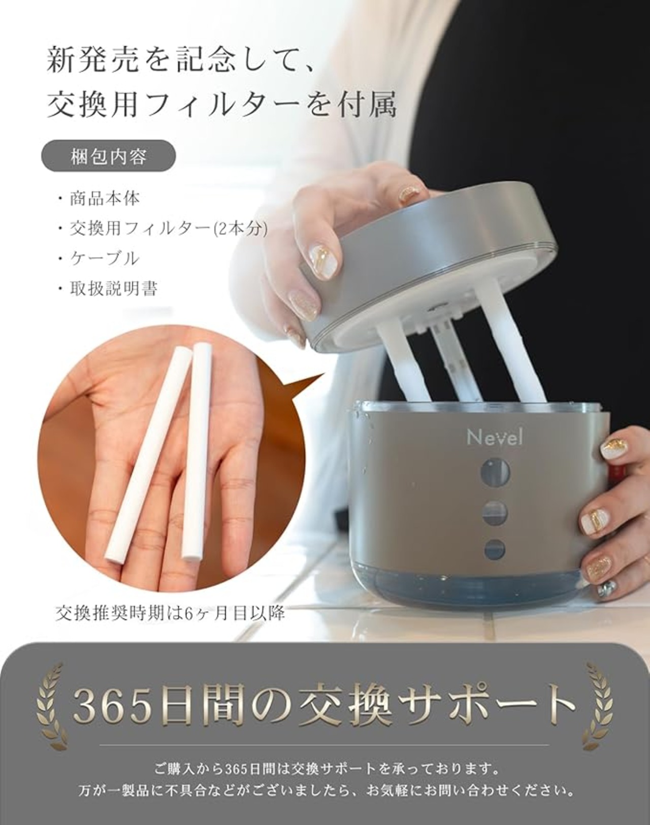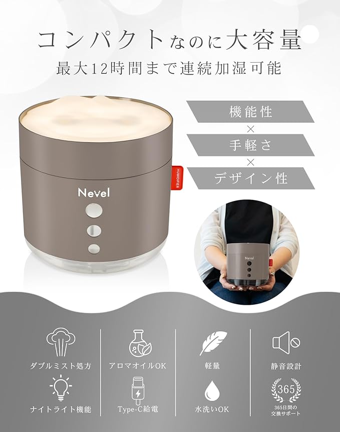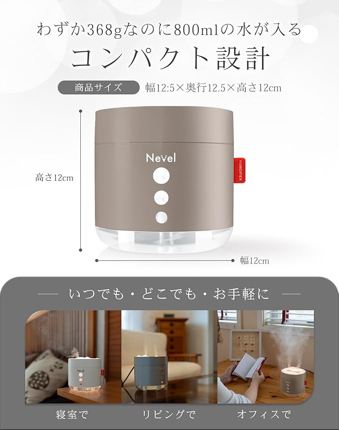【コンパクト&デザイン性】Nevelの加湿器は、わずか368gの軽量・小型設計。幅12.5 奥行12. 高さ12㎝のコンパクトサイズで場所を取らず、寝室やデスクにも最適。日本設計の洗練デザインで、ホワイト・ベージュ・ダークグレーの3色展開。