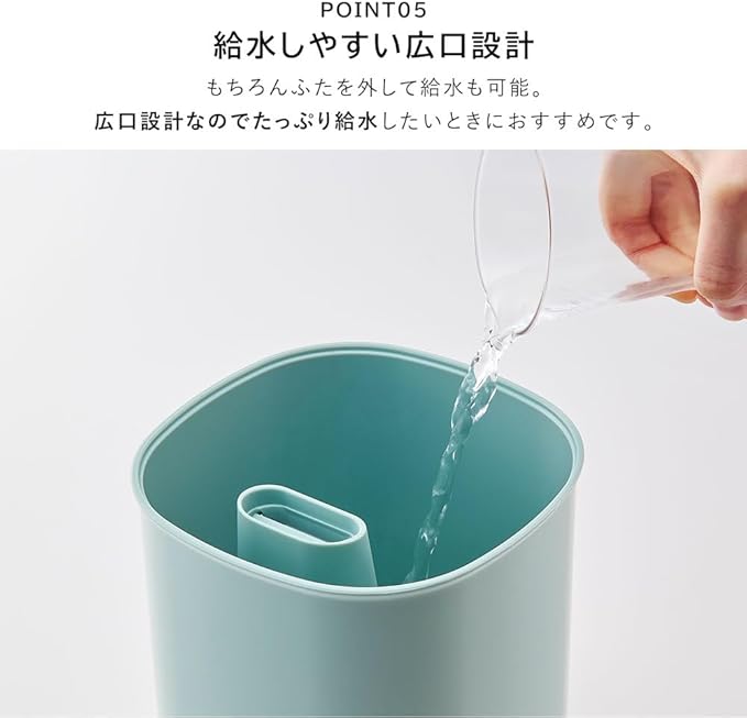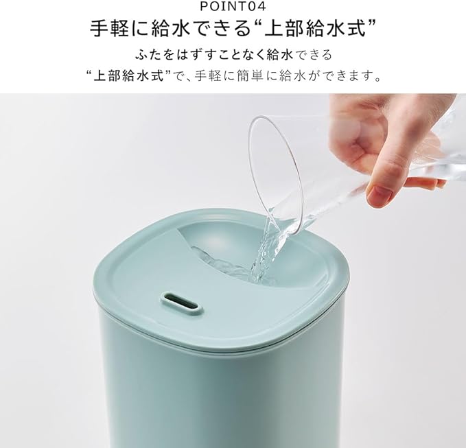 【上部給水式】 ふたをはずすことなく給水ができる上部給水式で簡単に給水ができます。 水タンクは簡単にはずして洗えるのでお手入れにも便利です。