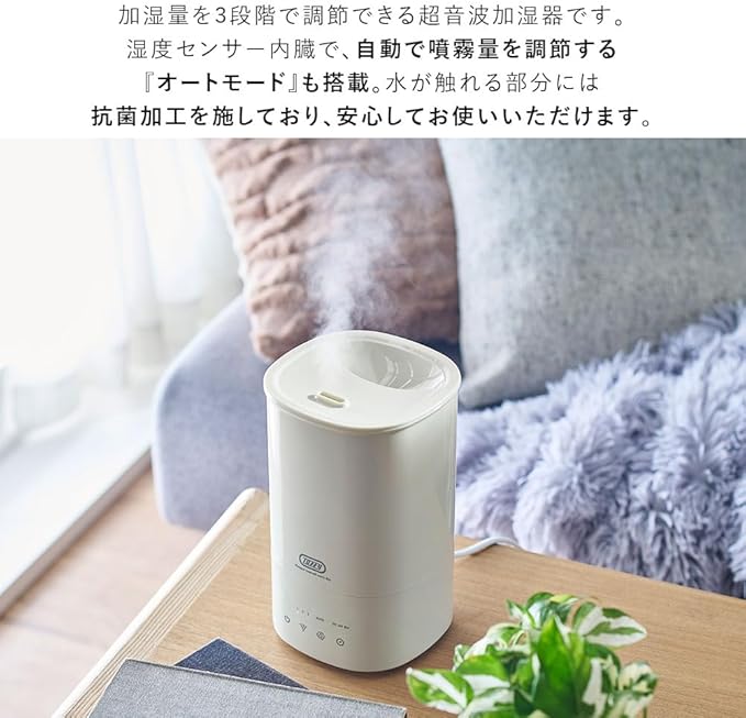 ふたをはずすことなく給水できる“上部給水式”の加湿器。 加湿量は3段階で調節可能。