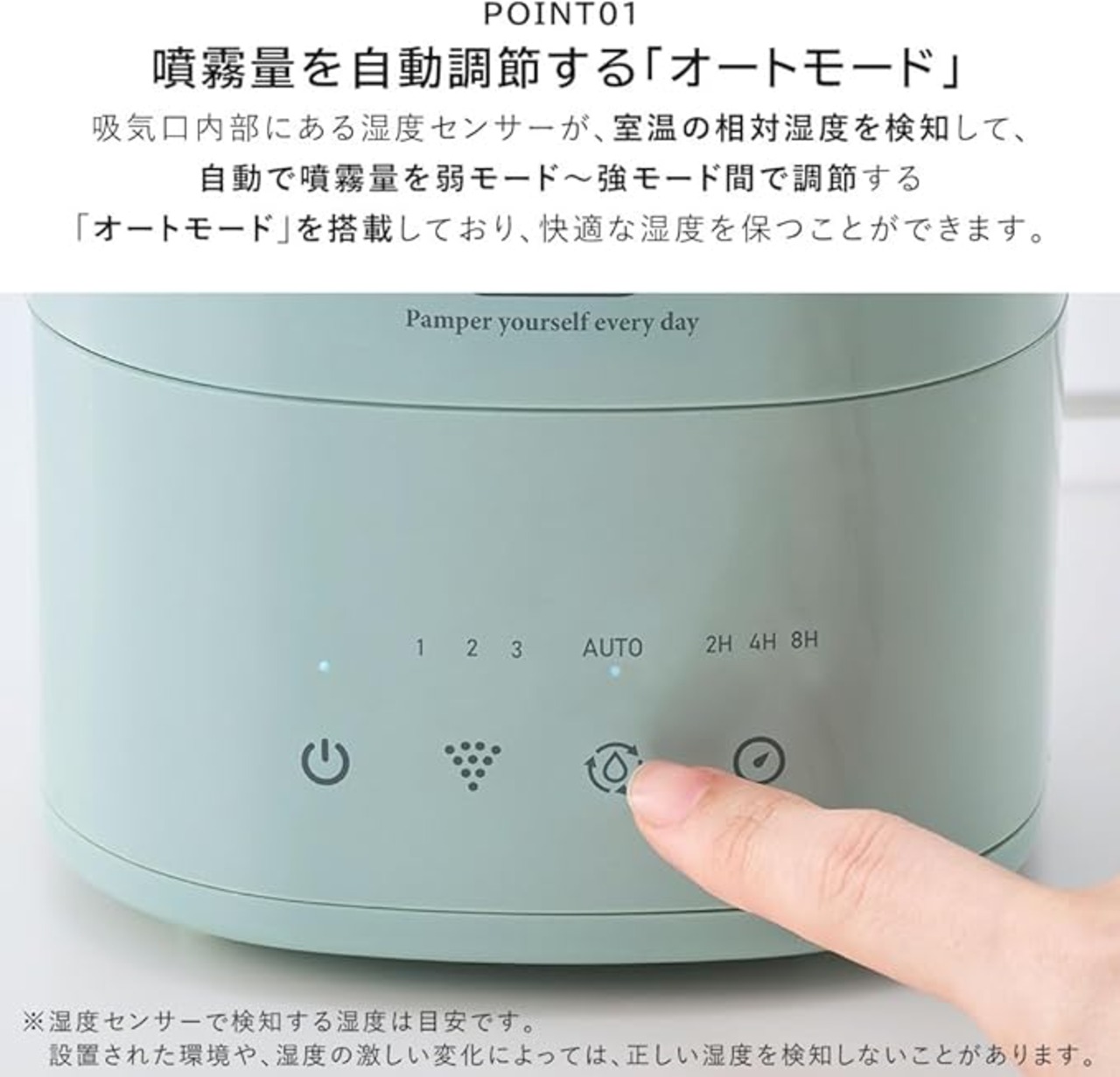 自動で噴霧量を弱モード~強モード間で調節し、快適な湿度を保つことができます!