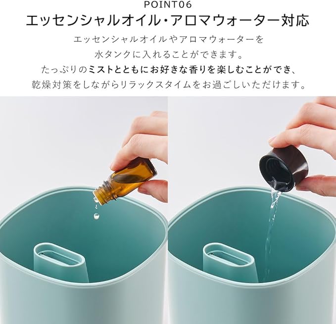 【アロマウォーター・エッセンシャルオイル対応】 アロマウォーター、エッセンシャルオイルに対応しており、どちらも水タンクに直接滴下OK!