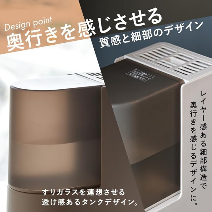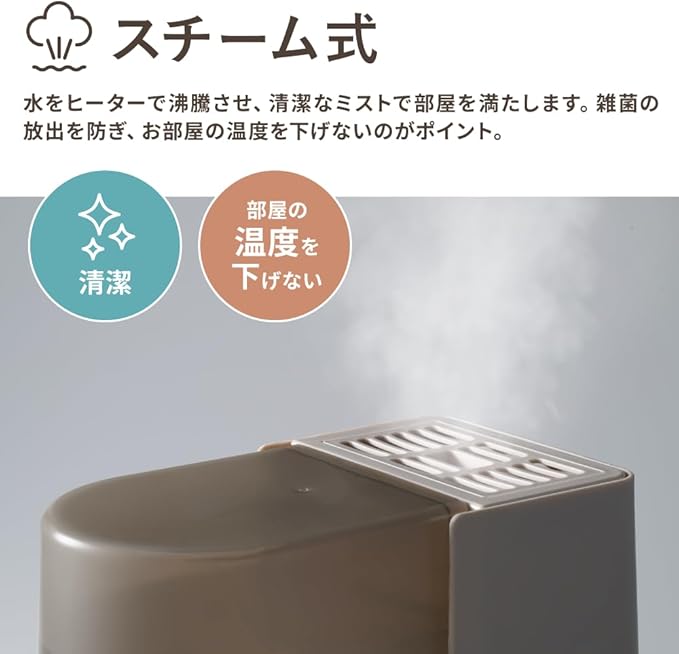 清潔な蒸気で加湿するスチーム式。水をヒーターで沸騰させ、清潔なスチームで部屋を満たします。雑菌の放出を防ぎ、お部屋の温度を下げないのがポイント。電源スイッチ一つでオンオフできる簡単操作で、加湿量は1段階のみのシンプル機能です。