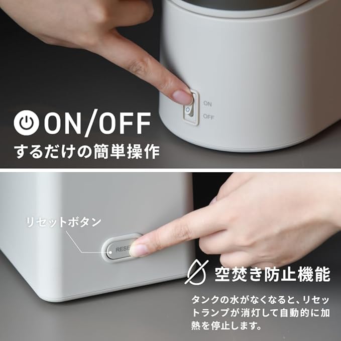 安全かつ簡単に使える機能。電源スイッチを入れると約2〜5分後にスチームが噴出。お湯が沸くまでにかかる時間が少なく、すぐ加湿できるのがポイント。タンクの水がなくなると自動的に加熱を停止する空焚き防止機能も付いているので安心。水タンクが空になった後に再度運転する際は、リセットボタンを押してランプを点灯させてください。