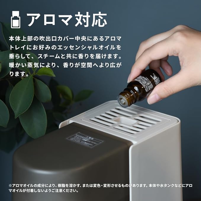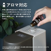 アロマ対応でスチームと香りを届ける。本体上部の吹出口カバー中央にあるアロマトレイにお好みのエッセンシャルオイルを垂らして、スチームと共に香りを届けます。暖かい蒸気により、香りが空間へより広がります。