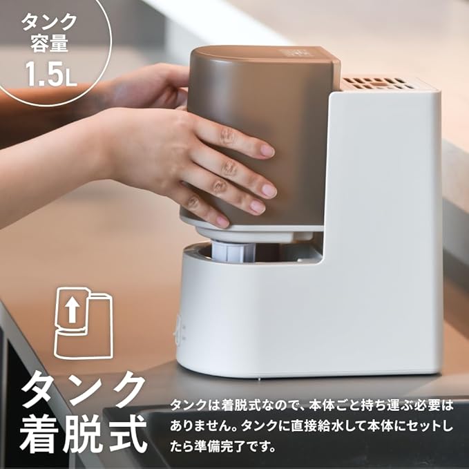 着脱式タンクで給水もラクラク。タンクは着脱式なので、本体ごと持ち運ぶ必要はありません。タンクに直接給水して本体にセットしたら準備完了です。