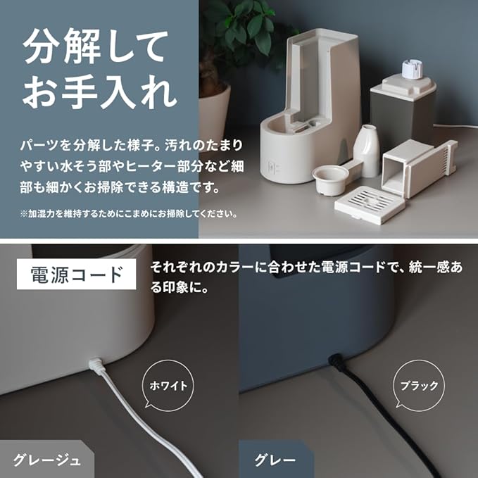 分解してお手入れ。パーツを分解した様子。汚れのたまりやすい水そう部やヒーター部分など細部も細かくお掃除できる構造です。 ※加湿力を維持するためにこまめにお掃除してください。