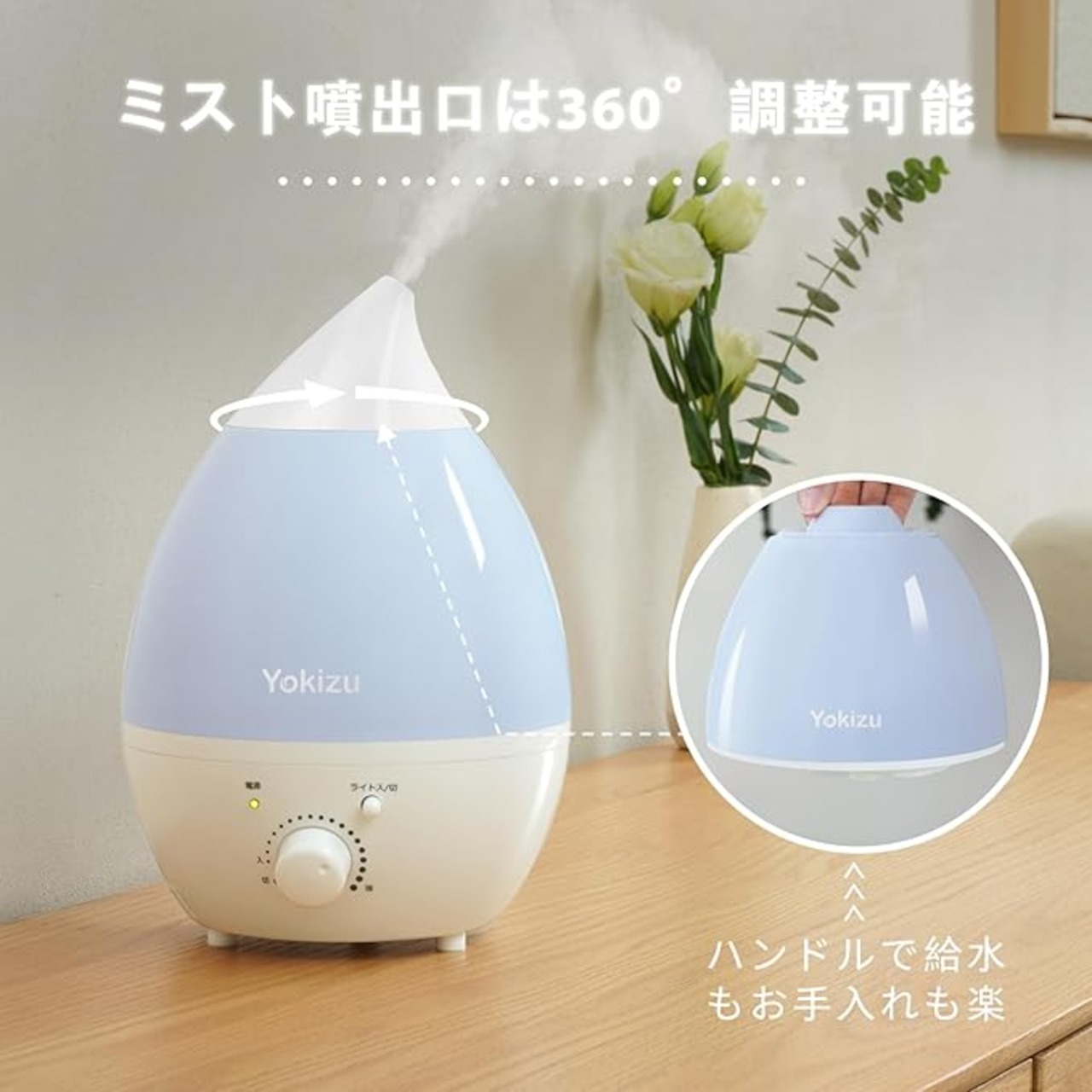 【かわいいしずく型・手入れしやすい】シンプルな小型加湿器で、寝室やリビング、オフィスにぴったりです。ハンドル付きで持ちやすく、給水やお手入れの際に便利です。吹出口は360 回転できるので、壁や家具にミストが付着してしまう心配もありません、狙った場所を効率よく加湿できます。