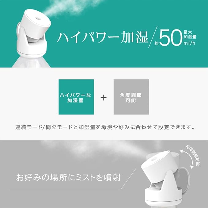 ●角度調節可能でお好みの場所にミストを噴射できる。