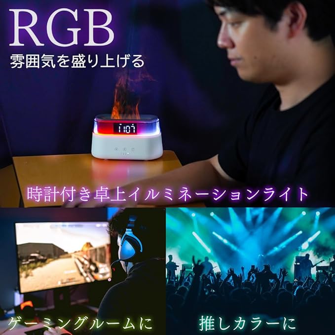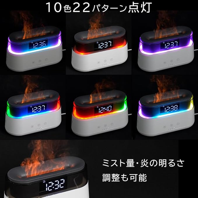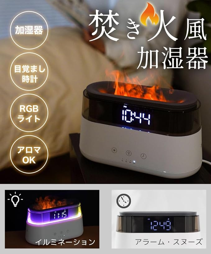 ■ゆらぎの炎に癒される、様々なイルミネーションが楽しめる目覚まし機能付き卓上加湿器