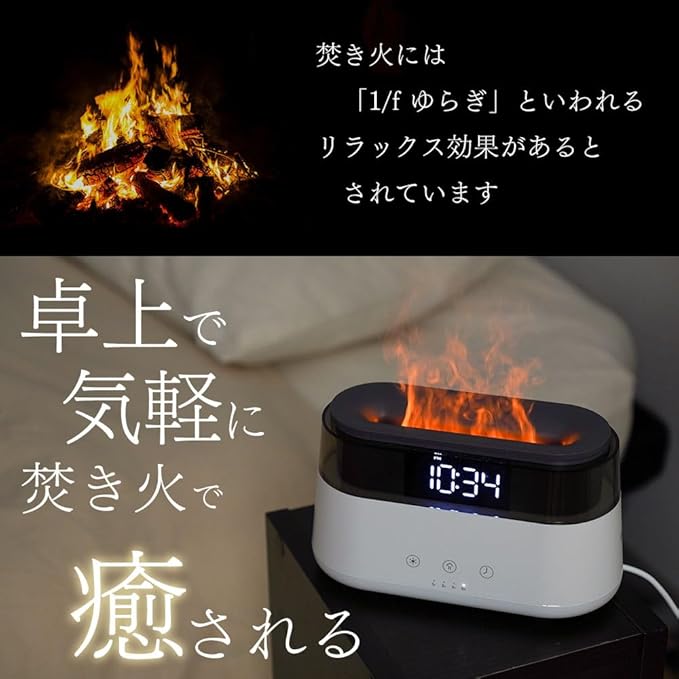 焚き火の炎で癒される、時計付き卓上加湿器です。