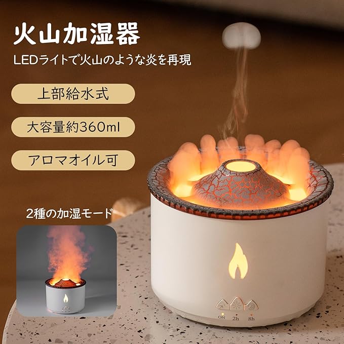 火山 加湿器 炎 アロマ 加湿器 卓上 超音波式 癒し 揺らぐ炎 8時間タイマー 360ml大容量 2色LEDライト 空焚き防止 上から給水 静音 乾燥対策 インテリア オフィス リビング 寝室用
