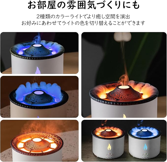 【選べる2種の「炎」モード】お好みで選べる2種の「炎」で、お部屋の加湿はもちろん 揺らぐ炎を見ながら極上の癒し空間を提供いたします。ポンポンと等間隔で噴射するクラゲのような「炎」が出てとっても可愛です。ミストを連続で噴霧し、LEDライトで火山のような炎を再現します!