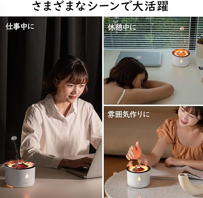 【お好みのアロマに対応】火山加湿器は、ミスト噴霧による加湿機能はもちろん、アロマオイル等を入れればアロマディフューザーとしても使えます。炎状のゆらぎを視覚で楽しみながら、お好みのアロマオイルで香りをお楽しみいただけます。
