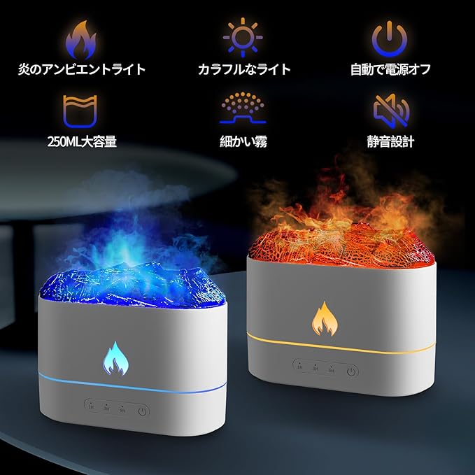 加湿器 小型 卓上 250ml 卓上 超音波式 アロマディフューザー USB給電式 炎 おしゃれ加湿器 LEDライト 静音 アロマ対応 ミニ 空焚き防止 除菌 寝室/オフィス/デスク 乾燥/花粉症対策 日本語説明書付き