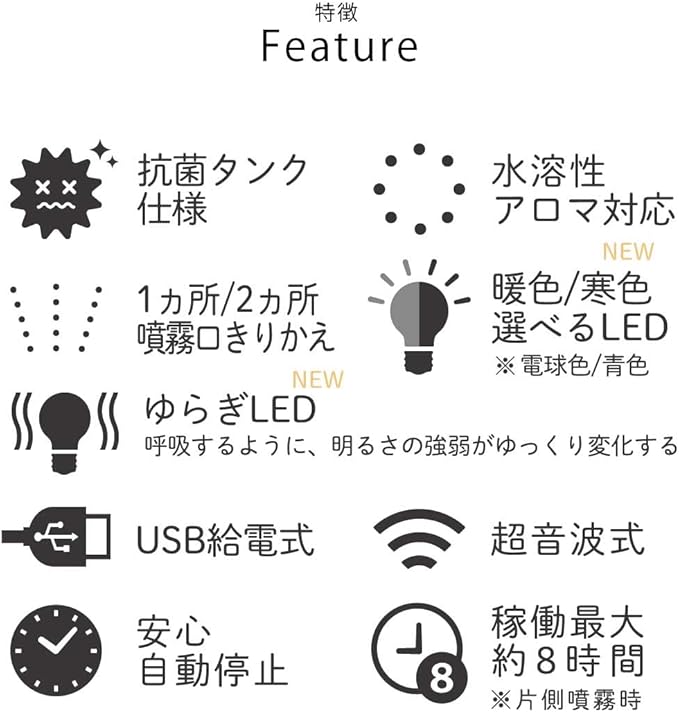 【注意事項】 本製品は「水溶性アロマオイル」「アロマウォーター」対応です。精油、エッセンシャルオイルはご使用できません。抗菌仕様につきましては、すべての菌で効果が実証されているわけではございません。付属のUSBケーブル以外のご使用は故障の原因となる可能性がございます。 必ず付属のUSBケーブルをご使用ください。