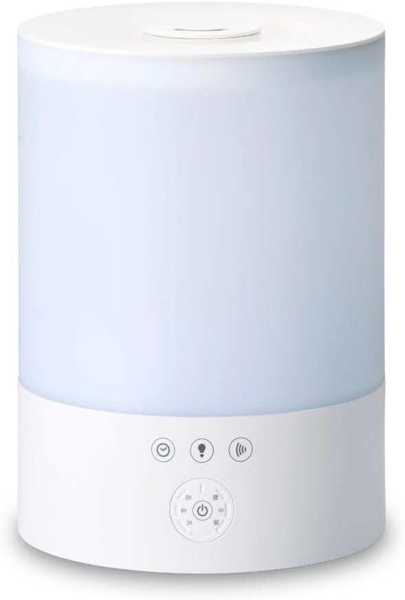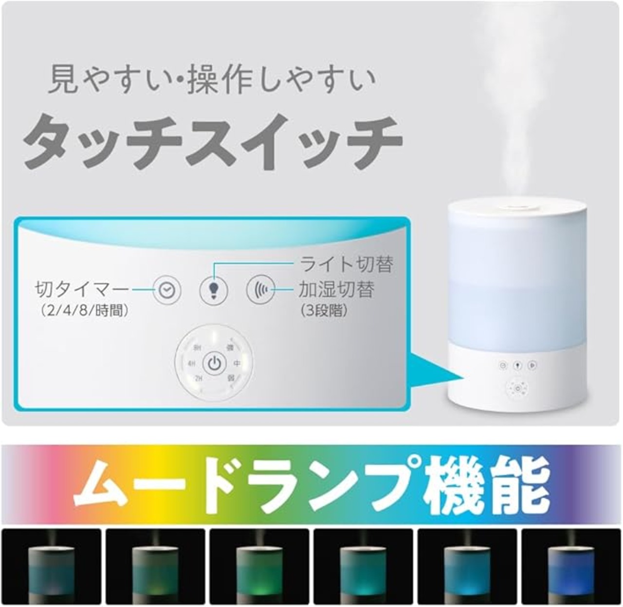 超音波式加湿量(約)200ml/h。加湿切替:3段階 タンク容量:(約)2.5ℓ 連続加湿時間:(約)10時間(強運転時)