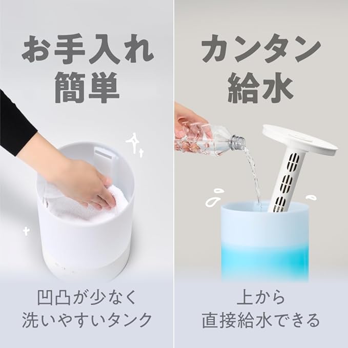 上から直接給水できるカンタン給水。凹凸が少なく洗いやすいタンクでお手入れ簡単。