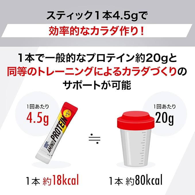 効率的なカラダづくりには、アミノ酸の量より組み合わせが重要です。味の素KKが考えたホエイプロテイン EAAの独自配合により、スティック1本で市販プロテイン20gと同等の運動によるカラダづくりをサポートします