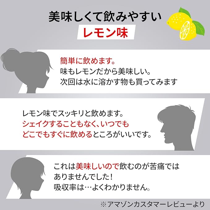 すっきり、飲みやすい、美味しいレモン味の顆粒(粉末)タイプなので、水と一緒に直飲みすることが出来ます。