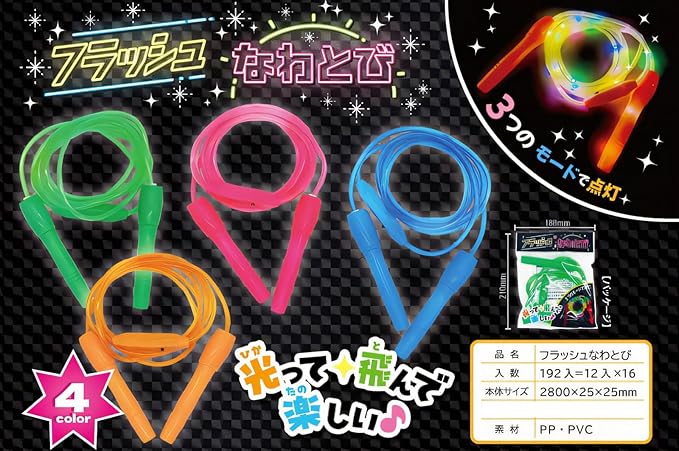 光るおもちゃ:鮮やかに光る!「フラッシュなわとび」です!なわとびの色はピンク、オレンジ、青、緑の4色展開!たのしくなわとびをとんじゃおう!