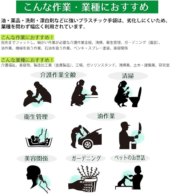 劣化しにくく、油や薬品に強く作業性に優れたプラスチック手袋です。弾力があり着脱が容易なので、幅広いシチュエーションで使用できます。