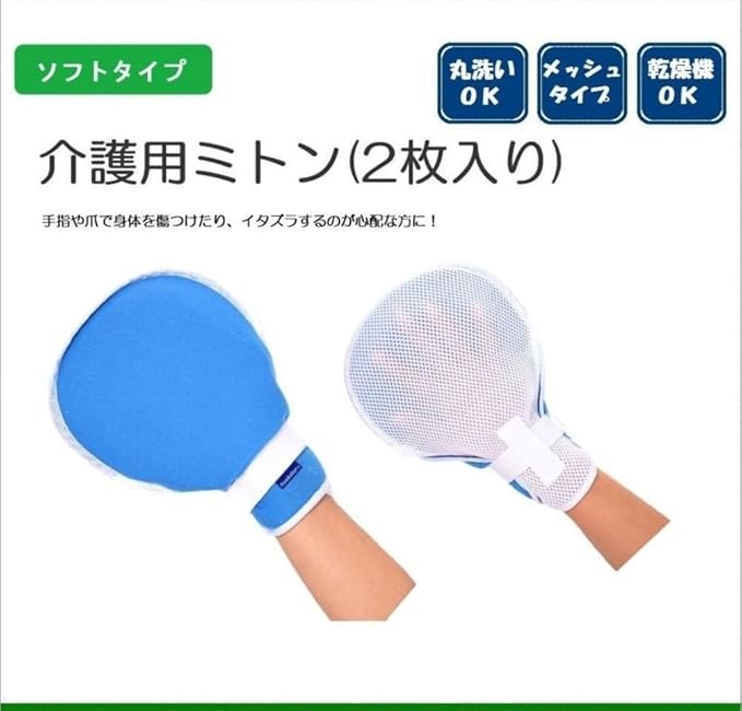 介護ミトン ソフト メッシュ 手袋 介護 用品 ミトン グローブ 認知症 自傷 いたずら 防止 2枚 セット [取り扱い説明書付き] A318 (紐パット無し2枚)