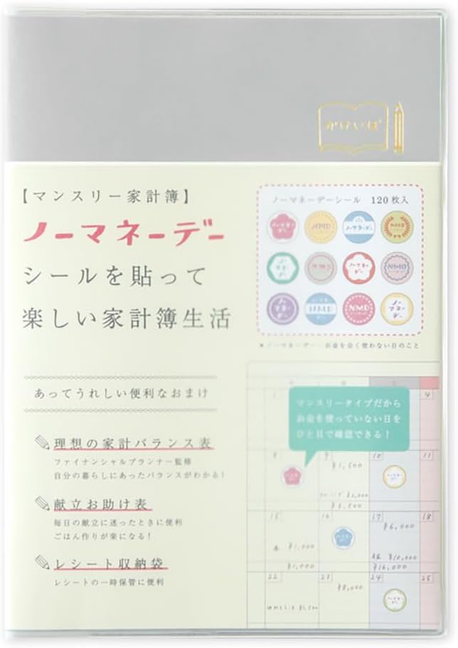 ノーマネーデー 家計簿 マンスリー ライトグレー・家計簿 A5サイズ 日付なし MHKN-11 ノーマネーデーシール レシート収納袋 リュリュ