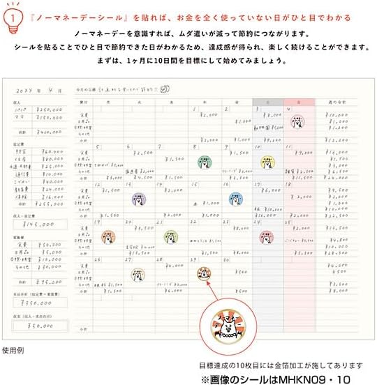 ノーマネーデーを意識して、ムダ遣いを減らすことを目的としたマンスリー家計簿です。 お金を使わなかった日に、付属のノーマネーデーシールを貼る事で楽しくノーマネーデーが意識が出来ます。 本文は、家計簿初心者さんでも始めやすいマンスリータイプ。 手帳の様なデザインの様になっていて、日付を自身で書き込むタイプなので、自分の好みや、お給料日のタイミングなど、お好きなタイミングから始められます。 家計簿ページ以外にも、ファイナンシャルプランナーが監修した、自分の暮らしにあった理想の家計バランスが解る「理想の家計バランス表」や、主婦の声から生まれた「献立お助け表」もついて、家計の見直しに役立ちます。 ■ノーマネーデーとは? ノーマネーデー(NMD)とは、お金を全く使わない日のこと。