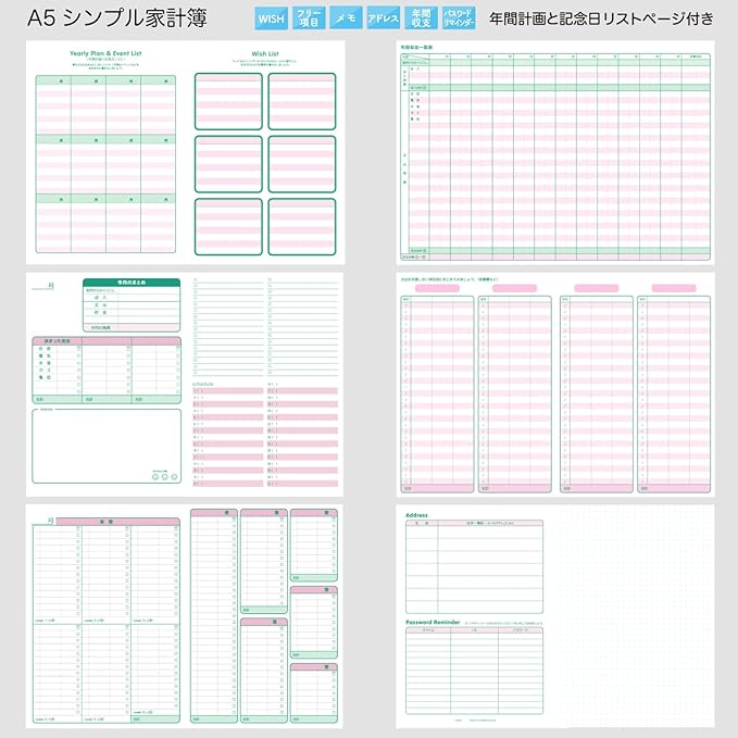 【内容】年間計画、ウィッシュリスト、月間収支一覧表、グリッドメモ、年間収支一覧表、フリー項目別控え、アドレス、パスワードリマインダー
