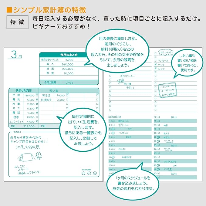 見開き1ぺージで1ヶ月のお金の流れが分かるから、初心者やズボラさん向け。