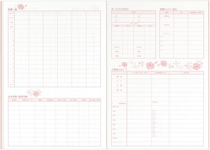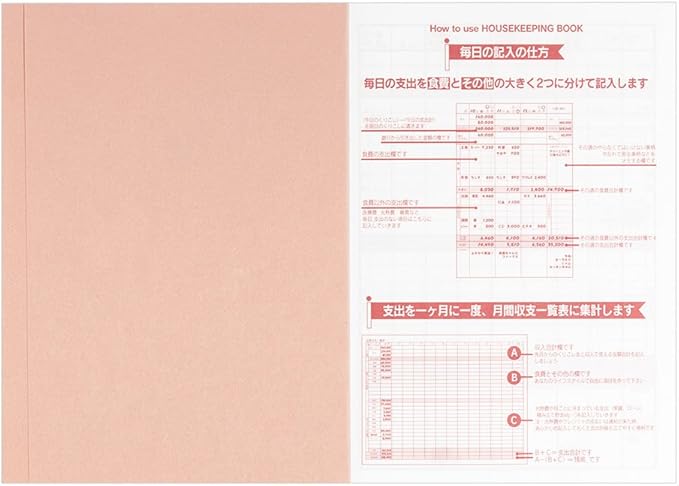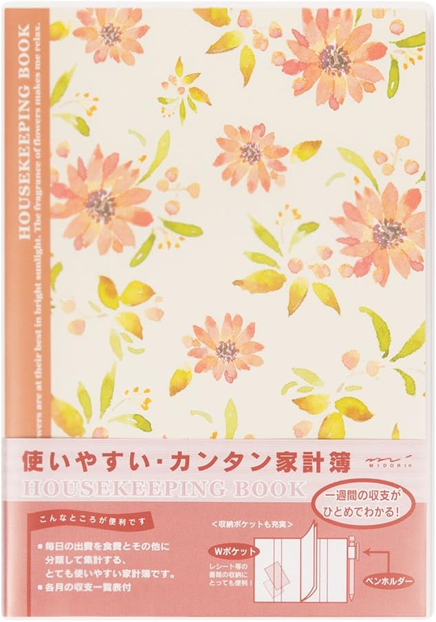 内容:中紙/128ページ・使用説明・週間家計簿・贈答品リスト・貯蓄・御用達リスト・メモ・月間収支一覧表(別紙)