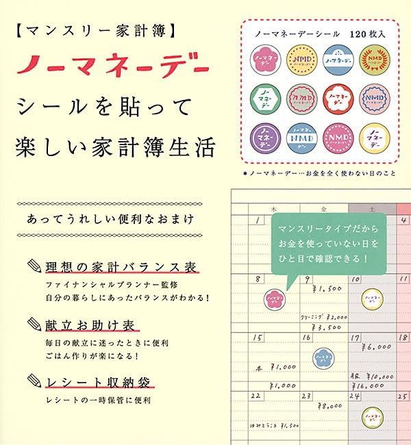 ノーマネーデーを意識して、ムダ遣いを減らすことを目的としたマンスリー家計簿です。 お金を使わなかった日に、付属のノーマネーデーシールを貼る事で楽しくノーマネーデーが意識が出来ます。 本文は、家計簿初心者さんでも始めやすいマンスリータイプ。 手帳の様なデザインの様になっていて、日付を自身で書き込むタイプなので、自分の好みや、お給料日のタイミングなど、お好きなタイミングから始められます。 家計簿ページ以外にも、ファイナンシャルプランナーが監修した、自分の暮らしにあった理想の家計バランスが解る「理想の家計バランス表」や、主婦の声から生まれた「献立お助け表」もついて、家計の見直しに役立ちます。 ■ノーマネーデーとは? ノーマネーデー(NMD)とは、お金を全く使わない日のこと。
