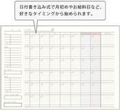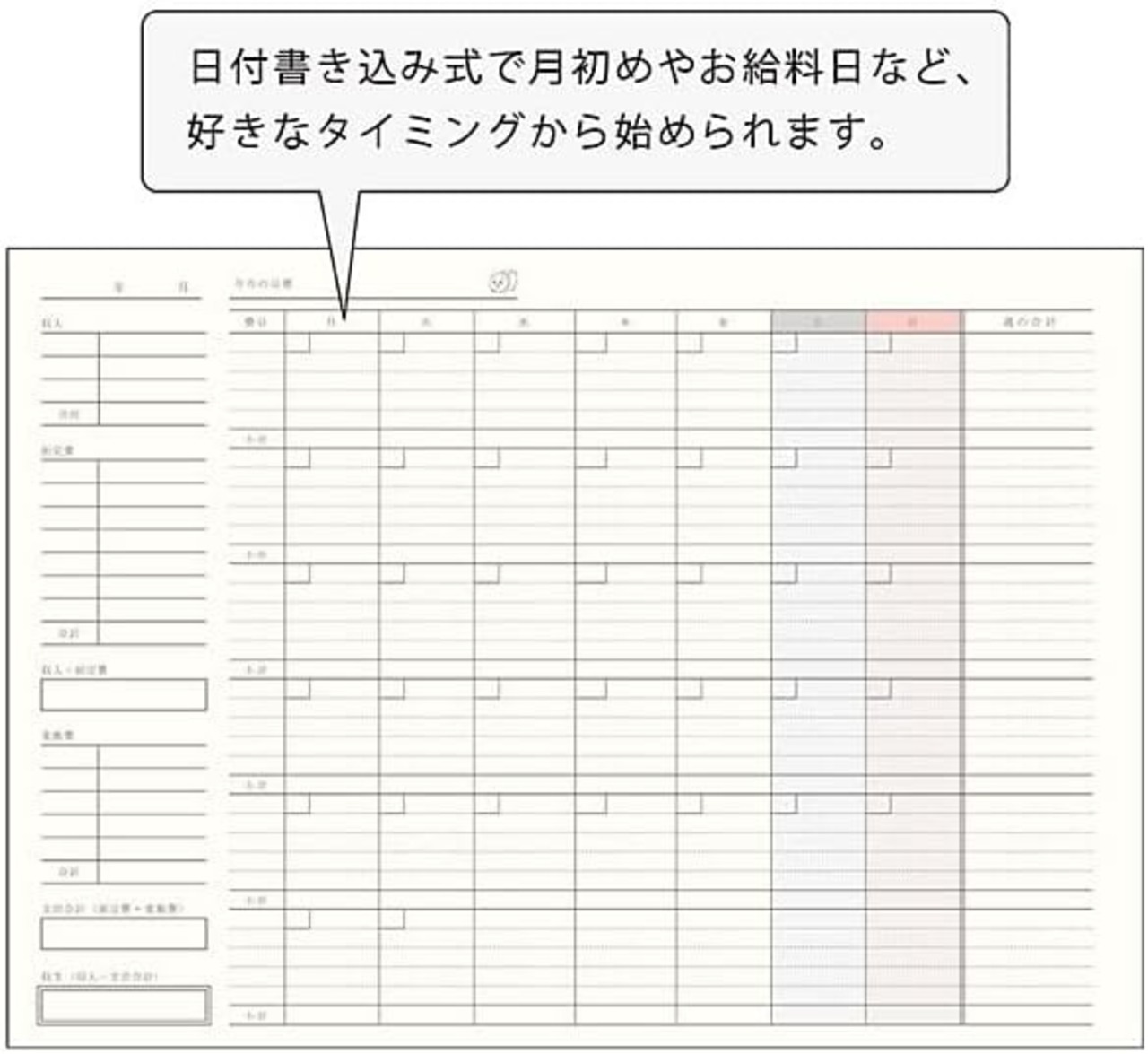 手帳の様なデザインの様になっていて、日付を自身で書き込むタイプなので、自分の好みや、お給料日のタイミングなど、お好きなタイミングから始められます。