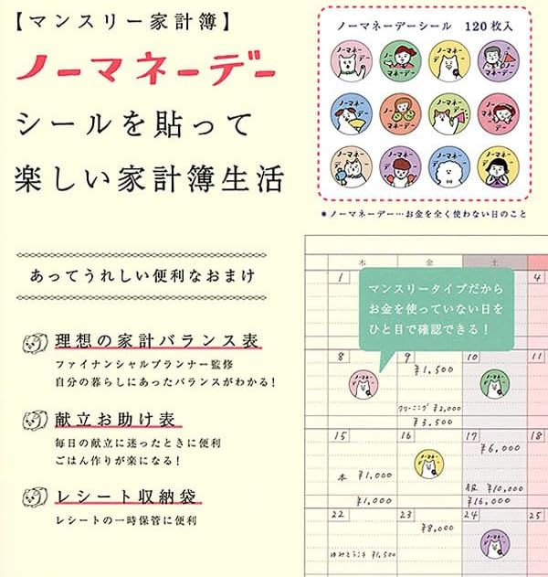 ノーマネーデーを意識して、ムダ遣いを減らすことを目的としたマンスリー家計簿です。 お金を使わなかった日に、付属のノーマネーデーシールを貼る事で楽しくノーマネーデーが意識が出来ます。 本文は、家計簿初心者さんでも始めやすいマンスリータイプ。 手帳の様なデザインの様になっていて、日付を自身で書き込むタイプなので、自分の好みや、お給料日のタイミングなど、お好きなタイミングから始められます。 家計簿ページ以外にも、ファイナンシャルプランナーが監修した、自分の暮らしにあった理想の家計バランスが解る「理想の家計バランス表」や、主婦の声から生まれた「献立お助け表」もついて、家計の見直しに役立ちます。 ■ノーマネーデーとは? ノーマネーデー(NMD)とは、お金を全く使わない日のこと。