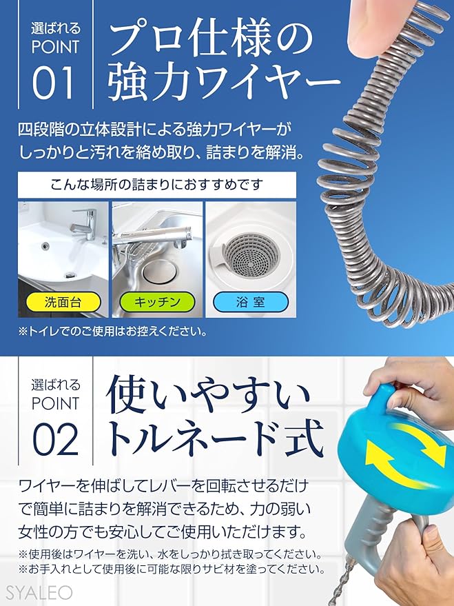 【使いやすいトルネード式】ワイヤーを伸ばしてレバーを回転させるだけで簡単に詰まりを解消できるため、力の弱い女性の方でも安心してご使用いただけます。※トイレでのご使用はお控えください。※使用後はワイヤーを洗い、水をしっかり拭き取ってください。※お手入れとして使用後に可能な限りサビ材を塗ってください。※ワイヤーを戻す際は手動になります。※無理にワイヤーを引っ張るとワイヤーが外れ壊れる可能性がりますので無理に引っ張らないようご注意ください。