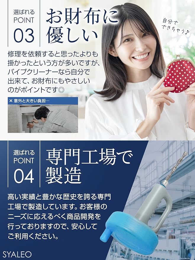 【お財布にやさしい】業者に依頼すると約1万5千〜2万円の費用がかかりますが、高い実績と豊かな歴史を誇る専門工場で製造した高品質な当製品を利用すれば、約2千円で経済的な負担なくトラブルを解消できます。 ※当商品は詰まりを100%解消する保証は致しかねます。場合により解決できないケースがございます。その場合は専門業者にご相談ください。 ※ワイヤーが4.5mを超えると本体から落ちる可能性があります。 そのためワイヤーを限界まで出しての作業は絶対しないようにしてください。