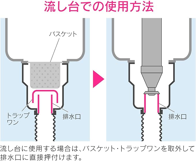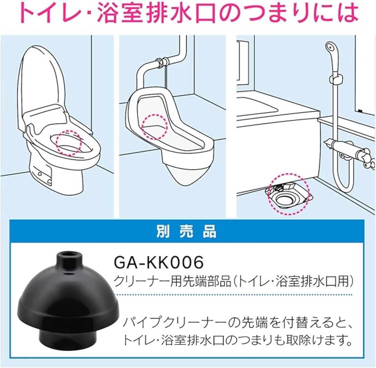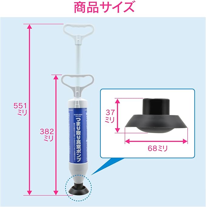 ●強力な吸引力と押し下げる圧力で詰まりや汚物を取除きます。●洗面台・流し台用真空式パイプクリーナー。●洗面台・流し台用の真空式パイプクリーナーです。●排水口にしっかりと押付けハンドルを上下すると、強力な吸引力と押下げる圧力でつまりを取り除きます。●パイプクリーナーの先端は取外しでき、別売りの先端パーツで様々な用途に使用可能です。