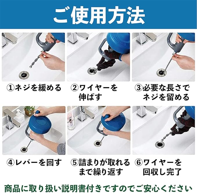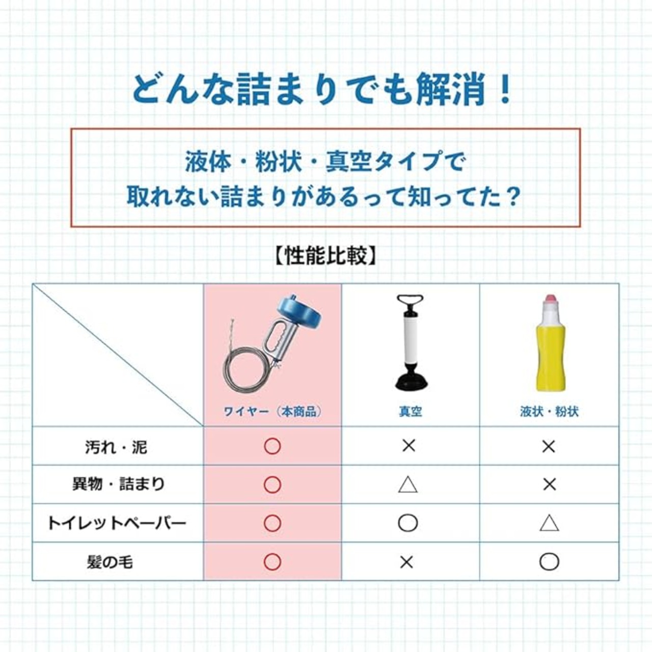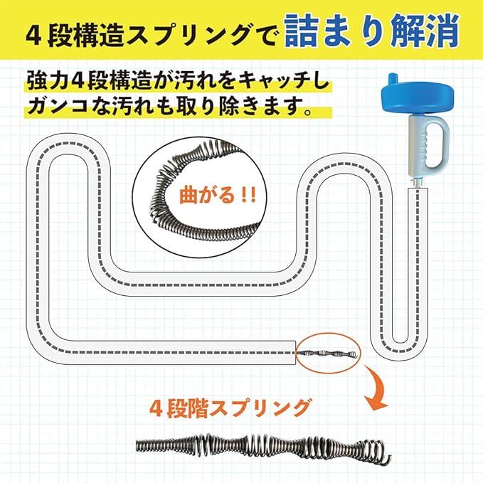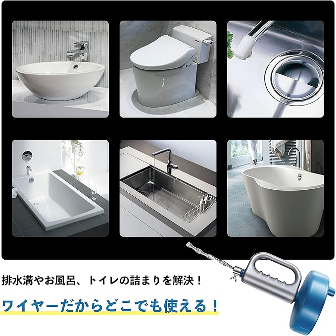 【業者要らず】業者に頼らずに水回りのトラブルを解消できるワイヤー式パイプクリーナー。液体タイプやラバーカップで解消できない詰まりや汚れも、ワイヤーで取り除くことが可能です。