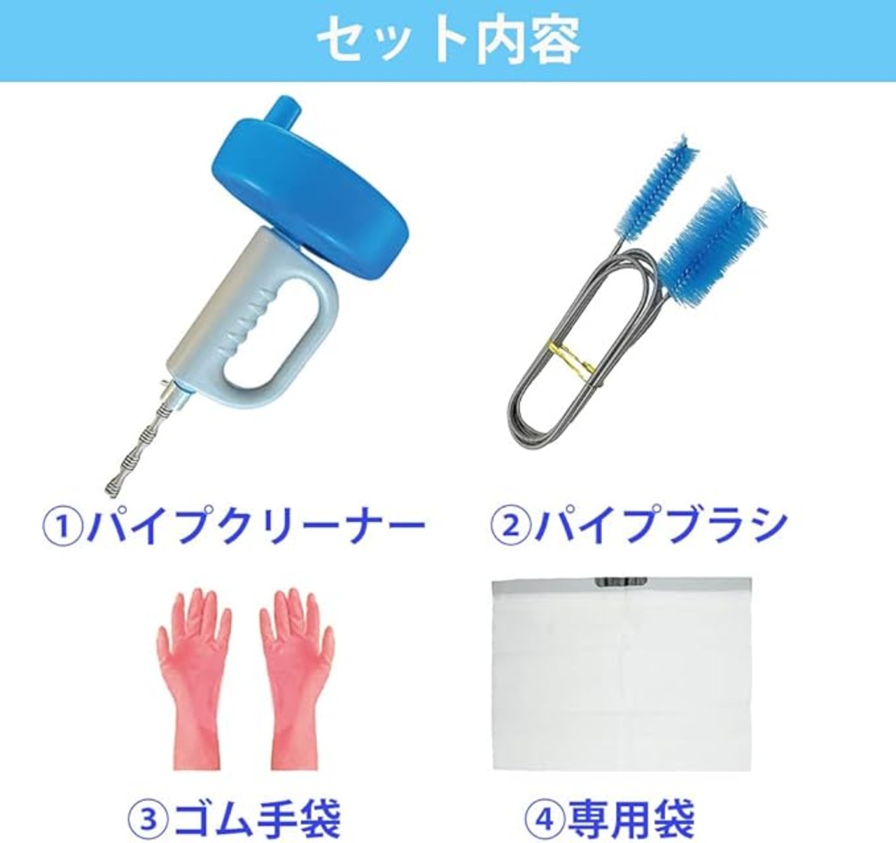 【セット内容】:パイプクリーナー本体(5m/10m)、パイプブラシ、ゴム手袋、専用袋、スポンジ、説明書