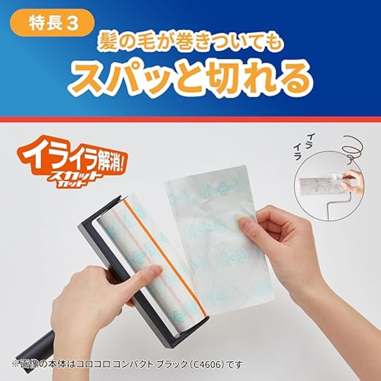 ●「スカットカット」オレンジライン入りでめくり口がすぐわかり、カンタンにめくれてスパッと切れる。長い毛が巻きついても紙がたてにやぶれにくい!
