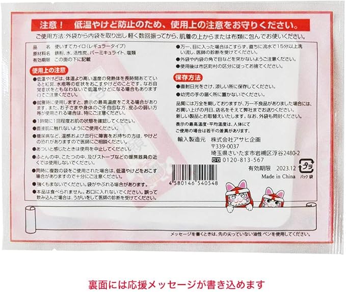 カイロ外袋:170mm 125mm カイロ本体:130mm 95mm 最高温度 68℃・平均温度51℃・持続時間18時間(40℃以上を保持し、持続する温度)