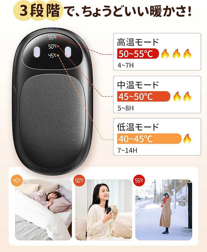 ✅【2025年日本初上陸!圧倒的コスパ!新世代充電式カイロ】もう使い捨てカイロに頼る必要はありません。1日限りで捨ててしまうと、3ヶ月で約3,600円のコストに…。HAGOOGIの充電式カイロなら、1回の充電は約1.26円、3ヶ月使っても300円未満。さらに、温度調節機能付きでシーンに合わせて快適に。充電すればくり返し使えるから、ゴミも出さずスマートに冬を楽しめます。お財布にも地球にもやさしい、この冬はもう手放せない!